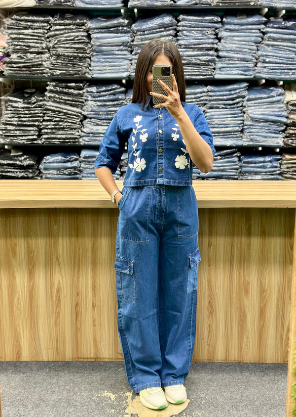 + Free ShippingThe top is a short-sleeved, button-closure denim shirt with white floral embroidery on the front. The bottoms are matching denim cargo pants with multiple pockets, featuring a wide-leg or relaxed fit. The set is made from denim, likely a comfortable and stretchable variety, designed for ease of movement and versatile styling. This coordinated set offers a casual yet chic aesthetic, suitable for various occasions, from daily wear to travel.